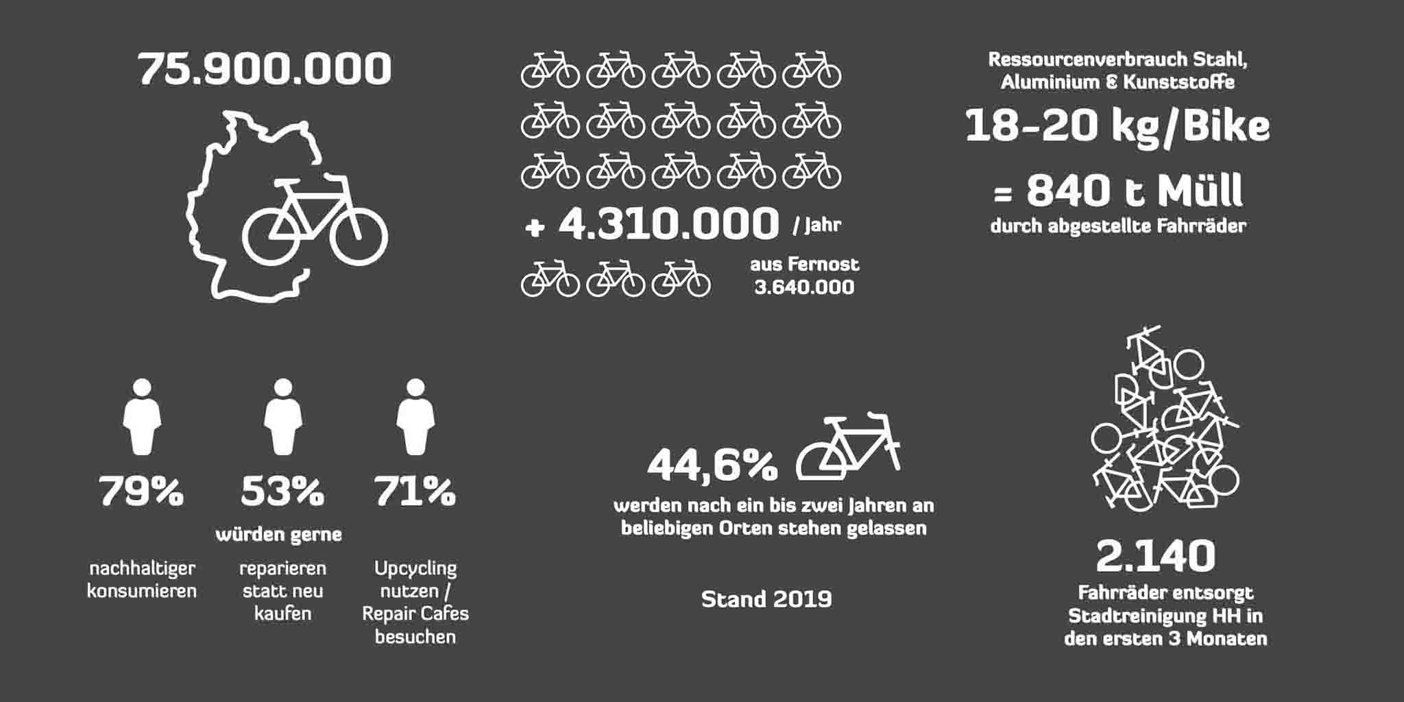In the first three months of 2019 alone, Hamburg's city cleaning service disposed of 2,140 bicycles. And this is the same in all major German cities. With an average resource consumption of steel, aluminum and plastics of 18 to 20 kg per bike, around 840 tons of waste are generated by parked bicycles. (Source: ZIV 2019)