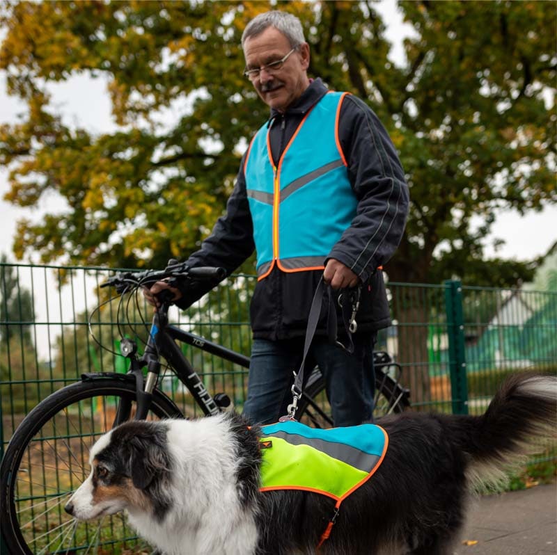 Whether on a bike, horse or on foot: the bright colors and reflective elements of the safety vest make everyone more visible in traffic. Day and night.
