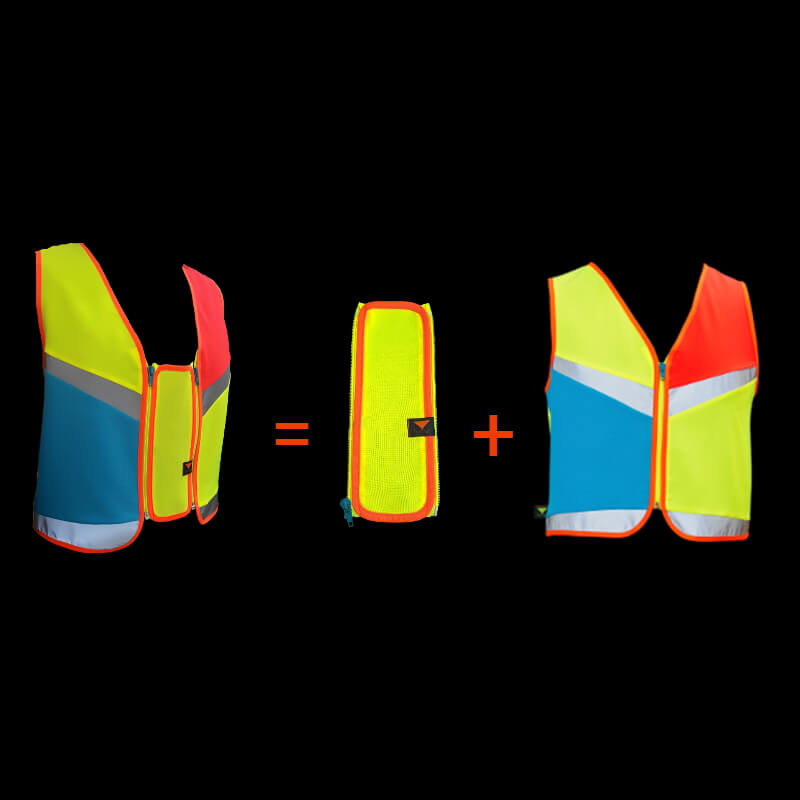 Le gilet pour enfant peut être porté en plusieurs tailles. D'après notre expérience, sans adaptateur, il s'adapte au moins à une veste de transition de taille 104 jusqu'à une veste d'hiver épaisse de taille 116.