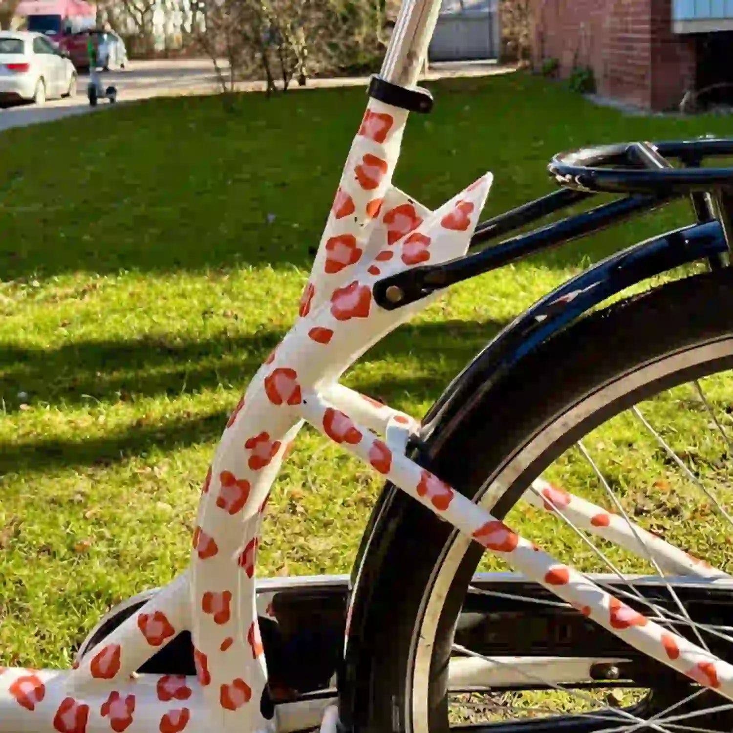 Wähle zwischen dem kontrastreichen Mix aus Lila & Gelb für einen coolen Retro-Vibe oder dem knalligen Orange-Pink für den ultimativen Pop-Art-Look. Die unregelmäßigen Leo-Spots lassen sich flexibel auf dem Rahmen verteilen, sodass jedes Fahrrad zum Unikat wird.